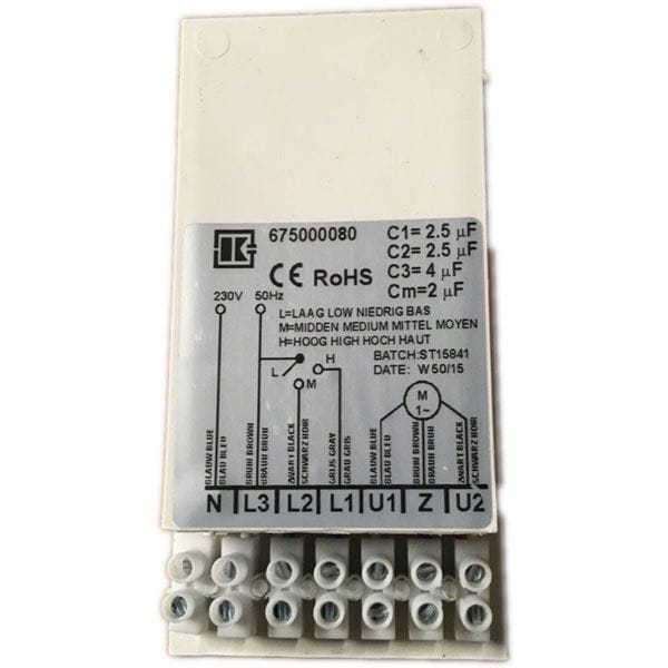 Ook geschikt als vervangende condensatormodule bij het nieuwere type EBM motor. (art.nr. 40017211, 1.5/2.5/4/2µF)