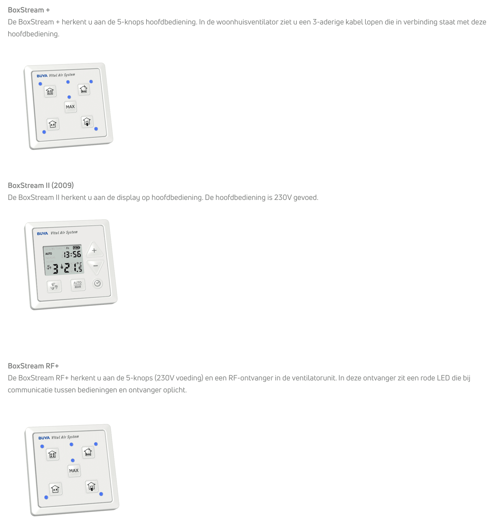 - Boxstream +, H2O (types met een 5-knops hoofdbediening aangesloten via zwakstroomkabeltje)